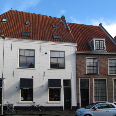 Pand met rechte kroonlijst en 19e eeuwse winkelpui, aan de Groenmarktzijde gepleisterd, uit 17e eeuw daterend huis aanwezig.