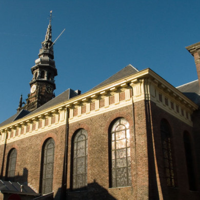 Fraaie toren in 1613 door Lieven de Key gebouwd tegen de oudere St. Annakerk, welke in 1645/9 door de huidige naar ontwerp van Jacob van Campen vervangen werd, steen met opschrift oostgevel.