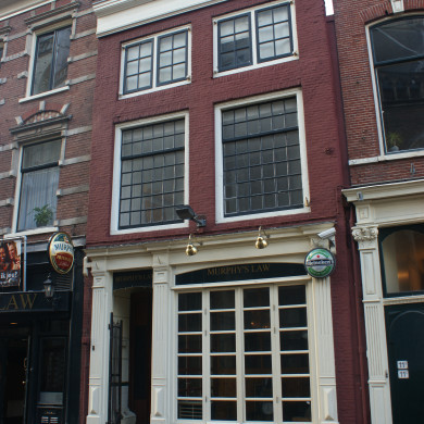 Hoog PAND met rechte kroonlijst, met consoles en metopen versierd in midden tympanon. Fraaie middenpartij met beeldhouwwerk om raam en ingang, gesneden deur, louis seize ornamenten. Gevel deels met dodekop bewerkt. Deels schuiframen met kleine roeden, 2e helft 18e eeuw.