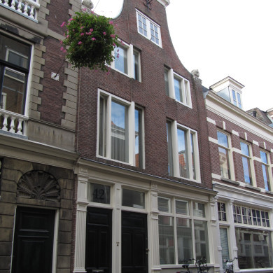 Pand met klokgevel met driehoekige frontonbekroning 1692, bloemen als voluten.