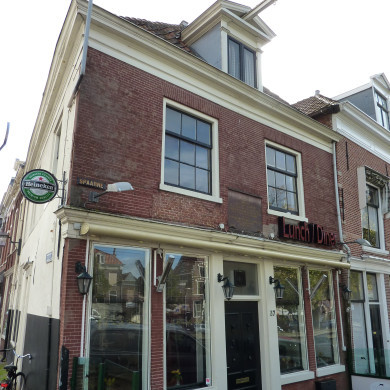 Pand met rechte kroonlijst, 18e eeuw, met gevelsteen; 'MDCLIII voor dit huis oefende Jan de Lapper zijn eenvoudig handwerk, verhief zich door beleid en moed tot scheepsbevelhebber en is strijdende voor het vaderland de heldendood gestorven'.