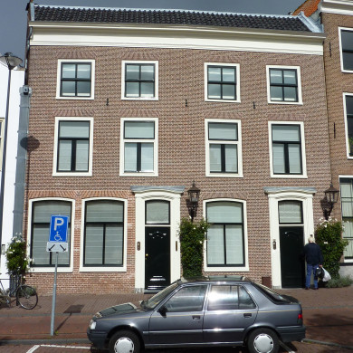 Pand met lijstgevel, horizontale hardstenen band, fraai gebeeldhouwde Louis seize deur.