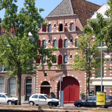 Pakhuis "'t Wapen van Gelderland" met zandstenen sierblokken, afgeknotte topgevel, rechte gootlijst. Twee fraaie leeuwenmaskers, 1612.