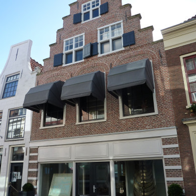 Pand met brede trapgevel, bovenverdieping met halve luiken en kruisvensters, aanvang 17e eeuw.