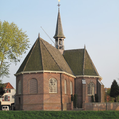 Ned. Herv. Kerk, bakstenen gebouw van 1627 met een langwerpige achthoekige plattegrond. N. pand met 3/8 sluiting later toegevoegd. Steunberen, halfrond gedekte vensters. Dakruiter, loden makelaarsversiering. Kerk-interieur: houten tongewelf. Preekstoel 1665, doophek en banden XVIIc. Eenklaviers orgel van onbekende maker, ca. 1700 gemaakt. Klokkenstoel met klok van Van Bergen, 1902, diam. 79,5 cm. Mechanisch torenuurwerk van Kramer, 1925.