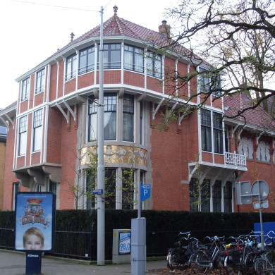 Rechterdeel van een in 1902 door E. Breman in overgangs-architectuur met neo-maniëristische en Art Nouveau invloeden ontworpen, aan vier zijden vrijstaande, DUBBELVILLA.