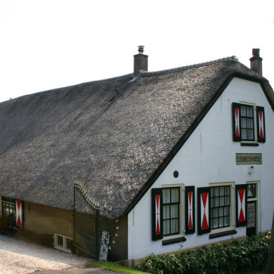 "Elisabethshoeve". BOERDERIJ, XVIII, met gaaf bouwlichaam en strodak. De gepleisterde voorgevel heeft oude kozijnen en ramen uit de bouwtijd.