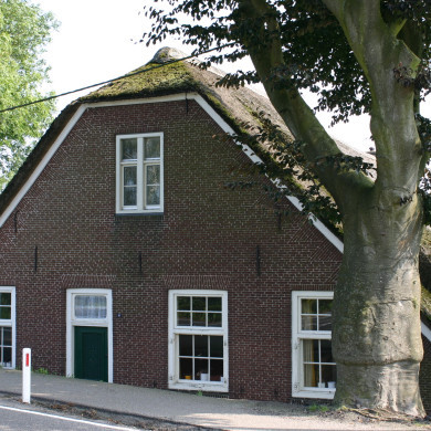 HOEVE (XVIII of ca. 1800) met strodak en in de voorgevel oude kozijnen, luiken en oorspronkelijke roedenverdeling.