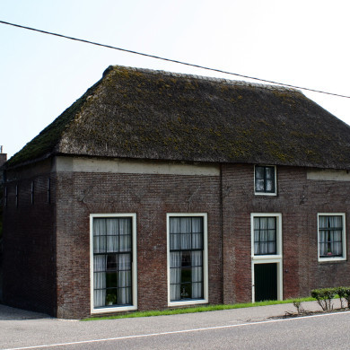 BOERDERIJ, 17e eeuw, met dwars woongedeelte onder rieten schilddak. Rechts een opkamer met in de vensters houten kruiskozijnen. Links vensters met zesruitsramen en luiken en in de zolderverdieping oorspronkelijke tweelichtskozijnen.
