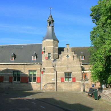 Raadhuis. Blijkens jaarankers in 1633 gebouwd, in 1917 gerestaureerd en aan de achterzijde met een raadzaal vergroot. Rechthoekig gebouw met zadeldak tussen trapgevels aan de korte zijde en een terzijde uitgebouwde zeskante traptoren. Voorgevel met natuurstenen waterlijst en banden. Stoepbordes uit 1917 ter vervanging van een 18e eeuws. Het gebouw hersteld na oorlogsschade in 1949. Inwendig een schouw met gebeeldhouwde hardstenen wangen en moerbalken uit de bouwtijd.