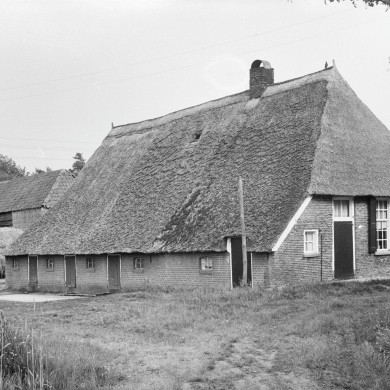 BOERDERIJ onder fors rieten schilddak; onderschoer. Schuifvensters met roedenverdeling, met luiken behangen.