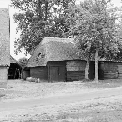 Evenwijdig met de weg gelegen houten schuurtje onder rieten schilddak.