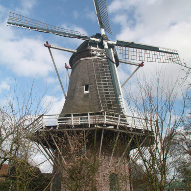 Achtkante bovenkruier met stelling.Bouwjaar 1859.Stenen onderstuk,houten bovenstuk en kap.Stalen as,houten roeden. Bouwjaar 1859.