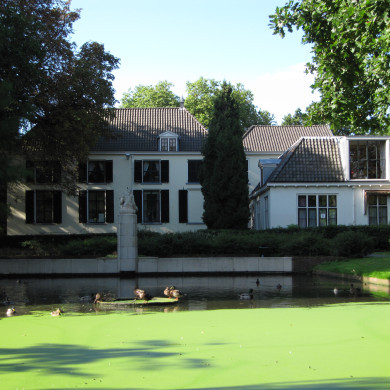 "Hofrust", achttiende-eeuws gepleisterd huis, thans van negeniende-eeuws aanzien, koepel in park.