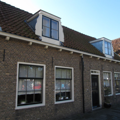 PAND onder zadeldak, evenwijdig aan de straat, 17e of 18e eeuw. In de 19e eeuw samengetrokken uit twee woningen. Dakkapellen met vleugelstukken.
