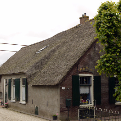 Boerderij. Eenvoudig van opbouw, voornaam zadeldak met riet gedekt en aan voor- en achterzijde afgewolfd. Goede indeling van de lichtopeningen.