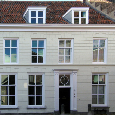 Een 18e eeuws herenhuis met rechte kroonlijst. Aardig op de wal gelegen tegenover het oude slot.