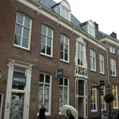 Statig patriciershuis onder dwars schilddak met dakkapel, bekroond door gebogen fronton. Hardstenen plint, gesneden consoles onder de kroonlijst. Gesneden deur met eenvoudig bovenlicht en verdiepte pilasters met rocococonsoles. Vensters met acht- en zesruitsschuiframen.