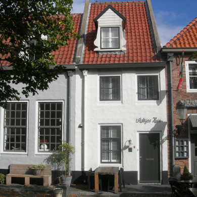 Hoekhuis met verdieping en hoog schilddak, in oorsprong waarschijnlijk laatmiddeleeuws.