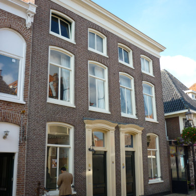 Langgerekt pand in oorsprong laat-middeleeuws met hoog schilddak. De voorgevel met kroonlijst, vensters met geprofileerde, hardstenen dorpels en stoep met balusters in vroeg 19e eeuw. Links in de gevel een kelderpoortje met trap naar de straat, waarvoor een smeedijzeren Empirehek.