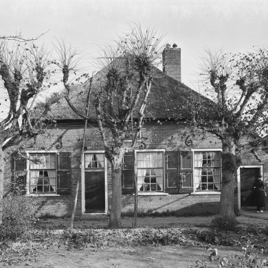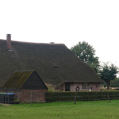 Boerderij van het Veluwse type, waarschijnlijk begin 19e eeuw, met rieten wolfdak en vensters met luiken en twintigruitsschuiframen.