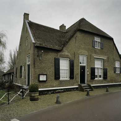Boerderij (XIX A?) onder rieten schilddak met inrijdeur onder puntgevel in rechter zijmuur. In de voorgevel vensters met luiken en roedenverdeling uit de bouwtijd.