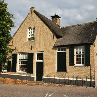 Fraaie boerderij onder rieten zadeldak met rechts inrijdeur en voorgevel met vlechtingen, waarin vensters met luiken en 20-, 9- en 6-ruits roedenverdeling. Zoldervensters met tweelichtskozijnen.