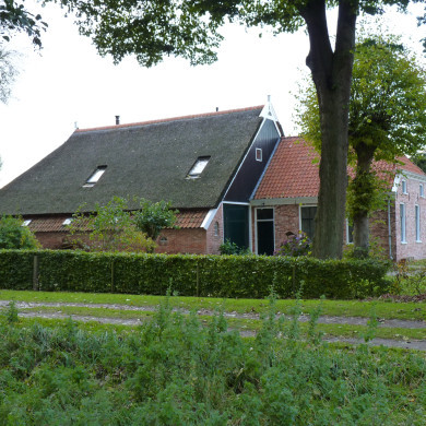 Boerderij van het Westerwoldse type; schuur met houten voorschot. Jaartalankers 1868.