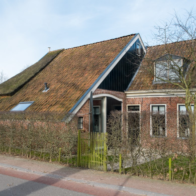 Kleine BOERDERIJ van Oldambtster type. Omlijste ingang in de voorgevel. Zesruitsvensters en drie grote zoldervensters in de voorgevel.