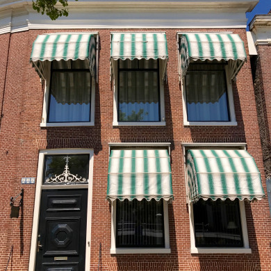 Diep PAND onder zadeldak tegen achtertopgevel. Voorzijde schilddak met topschoorsteen waarop bord. Boven de met metopen en triglyphen versierde kroonlijst. Dakkapel met gesneden klauwstukken XVIIId-XIX A. Vier stoeppalen met kettingen.