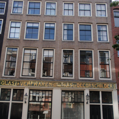 Pand met gevel (18e eeuw) onder rechte lijst (19e eeuw) geblokte pui.