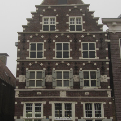 Dubbel pand gedekt door U-vormig zadeldak. Op het voorste dakschild twee schoorstenen met borden. Strakke gevel afgesloten door rechte kroonlijst met gesneden consoles waarboven twee dakkapellen met snijwerk omlijst, XVIII. Gevel XIX B bemetseld en van borstwering en stoep voorzien.