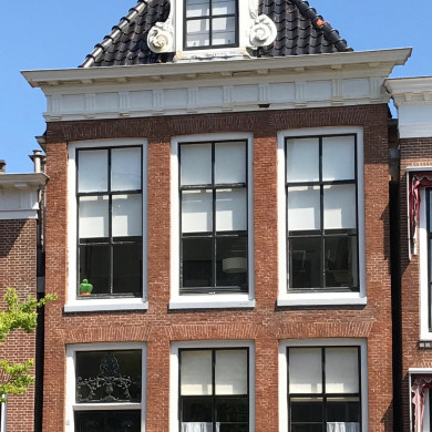Breed herenhuis, blijkens onregelmatige travee-indeling uit verschillende oudere panden samengetrokken. Voorgevel XIX A met rechte kroonlijsten twee grote dakkapellen voor schilddak met twee hoekschoorstenen gedekt door borden.