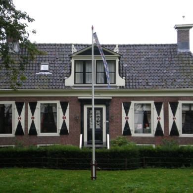 Boerderij met dwars woongedeelte. Het woongedeelte onderkelderd, omlijste ingang in het midden, zesruitsvensters en grote dakkapel; schilddak met hoekschoorstenen waarop borden. Inwendig betegelde keuken met oude bedsteemuren en servieskast; in westelijke kamer betimmering met schilderstukjes op de schouw; beschilderd behang. Fraai gelegen op omgracht terrein met oud hout, aan de oostzijde boomsingel.