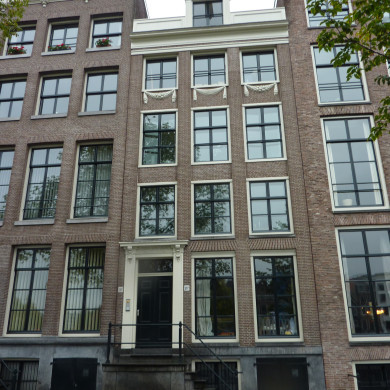 Hoekpand (tweede kwart zeventiende eeuw) omvattende twee woningen onder een dak, met gepleisterde ingezwenkte halsgevel boven originele zandstenen kelderpui (tweede kwart zeventiende eeuw). Gesneden houten pui met deurkalven en snijramen (eerste kwart negentiende eeuw).