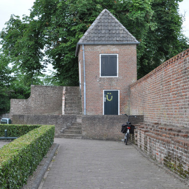 Aan de zuid-oostzijde der stad een GEDEELTE der middeleeuwse VESTINGMUUR met aansluitende wal en gracht tussen "Het Slot" en het punt waar "Het Hooge Huis" de Korte Kerkstraat afsluit.