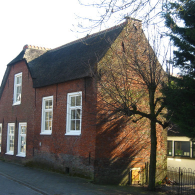 Boerderij uit de 17e eeuw onder rieten wolfdak, met rechts uitgebouwde opkamer, aansluitend tegen een puntgevel met vlechtingen. Vensters met zesruitsschuiframen.