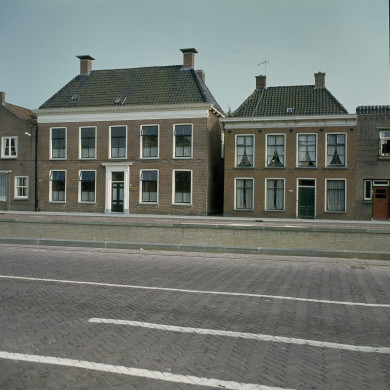 Vijf traveeën breed herenhuis met verdieping onder vierzijdig zadeldak met hoekschoorstenen, waarvan een met bord.