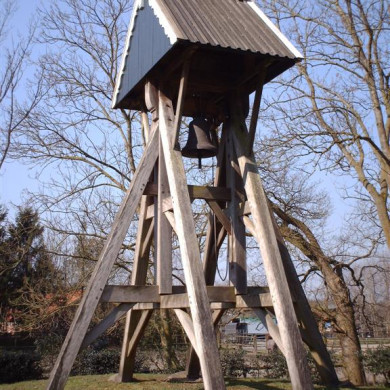 Op het kerkhof een door een zadeldak overhuifde klokkenstoel. Klokkenstoel met klok van anonieme gieter uit de 13e eeuw, diam. 58 cm.