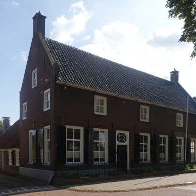 De Ned. Herv. ZAALKERK uit 1849, met preekstoel met fraai Lodewijk XIV-snijwerk, afkomstig uit de Gasthuiskerk te Zaltbommel, en twee zerkfragmenten, 17e eeuw.