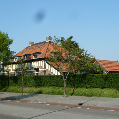Rechthoekig, in schoon metselwerk opgetrokken blok van vier rug-aan-rug WONINGEN onder met rode en blauwe muldenpannen gedekt schilddak met schoorstenen op de nokeinden en tegen het midden van de zijgevels; tegen de zijgevels voormalige stalletjes (thans keukens) onder met rode muldenpannen gedek