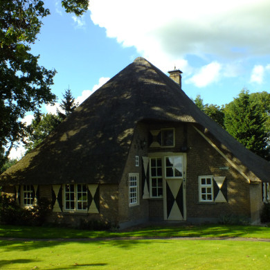 Boerderij met rieten wolfdak en inspringend gedeelte aan de kopgevel, waarin de ingang, tesamen met een venster in een kozijn gevat. De vensters met luiken behangen.
