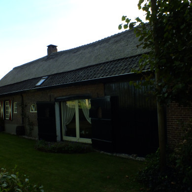 Boerderij onder een met riet en pannen gedekt wolfdak. In de lange zijgevel schuifvensters met roedenverdeling en met luiken, benevens inritten van deel en stal. Voorbeeld van de Brabantse langgevelhoeve uit eerste helft 19e eeuw.