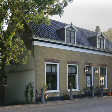 Zomerhuis met puntgevel, versierd met hoekvoluten en geprofileerde, gebogen fronton, waarin: 1763.