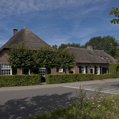 BOERDERIJ uit het midden van de 19e eeuw onder met riet gedekt wolfdak. Voorgevel met vlechtingen en vensters met luiken. Het woonhuis is links onderkelderd. Deur met panelen en onversierd bovenlicht.