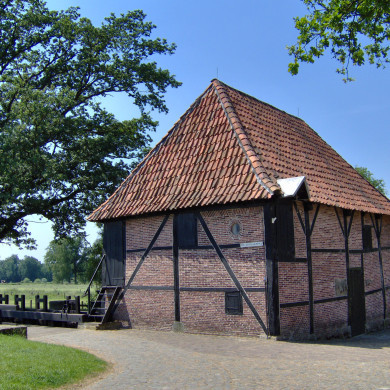 BOERDERIJTJE op L-vormige grondslag; dak gedekt met riet en pannen. Woongedeelte op plint van bentheimer steen; vensters met luiken en roedeverdeling.