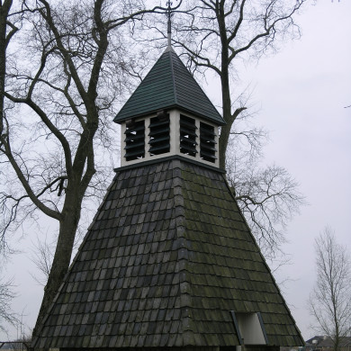 Door bomen omringd kerkhof waarop gesloten klokkehuis, de afdekking belegd met pannen, het geheel op stenen voet, waarin gebeeldhouwde steen herinnerend aan een herbouw in 1731. Op het kerkhof enige 17e en 18e eeuwse gebeeldhouwde zerken. Klokkestoel met klok van anonieme gieter uit de 14e eeuw, diam. 73,5 cm.