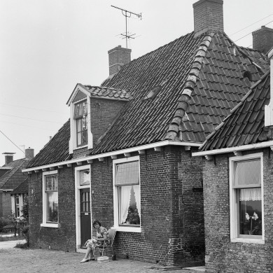 Eenvoudig pandje onder voor afgeschuind zadeldak, waarboven schoorsteen en waarvoor dakkapel.