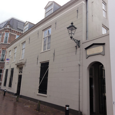 In oorsprong 16e eeuws - van 1570 tot 1629 in gebruik als "Vondelingenhuis"-, aan de straatzijden gebosseerd gepleisterd hoekpand met verdieping onder met Hollandse pannen gedekt zadeldak met schild (zuidzijde) en tegen in schoon metselwerk opgetrokken tuitgevel (noordzijde). Aan de straatzijden op de begane grond vensters met 8-ruits schuiframen voorzien van brede middenstijl en wisseldorpelklos en met luiken; op de verdieping 6-ruits schuiframen met brede middenstijl; dubbele deur met leeuwekopjes, snijlicht en gebosseerde omlijsting afgesloten door kroonlijst met consoles; staafankers met sierkrul. In de noordgevel twee 6-ruits schuiframen op de verdieping en een houten kloosterkozijn in de geveltop. Inwendig: gang met marmeren tegels; kelder met tongewelf onder opkamer; drie hoge stucwerk schoorsteenmantels; beschilderde houten kastenwand (XIX A); stucwerkplafond (XIX A); samengestelde balklagen; kap met eiken dekbalkjukken en grenen schaarspanten met balk. Aan de noordzijde en door een gang met het pand verbonden een achterhuis met verdieping onder met Hollandse pannen gedekt tentdak. In de gepleisterde oostgevel op de begane grond twee kruiskozijnen met onder luiken en boven 6-ruits raampjes; op de verdieping twee 6-ruits schuiframen; forse staafankers. Blinde, gepleisterde zij- en achtergevel(s). Op de begane grond grote keuken met brede schouw.