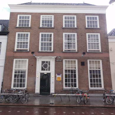 In oorsprong 16e eeuws en omstreeks 1850 gebosseerd gepleisterd hoekpand met verdieping onder met Hollandse pannen gedekt zadeldak met wolfeind boven de top twee verdiepingen verhoogde en door een kroonlijst met consoles en omlijste velden afgesloten voorgevel.